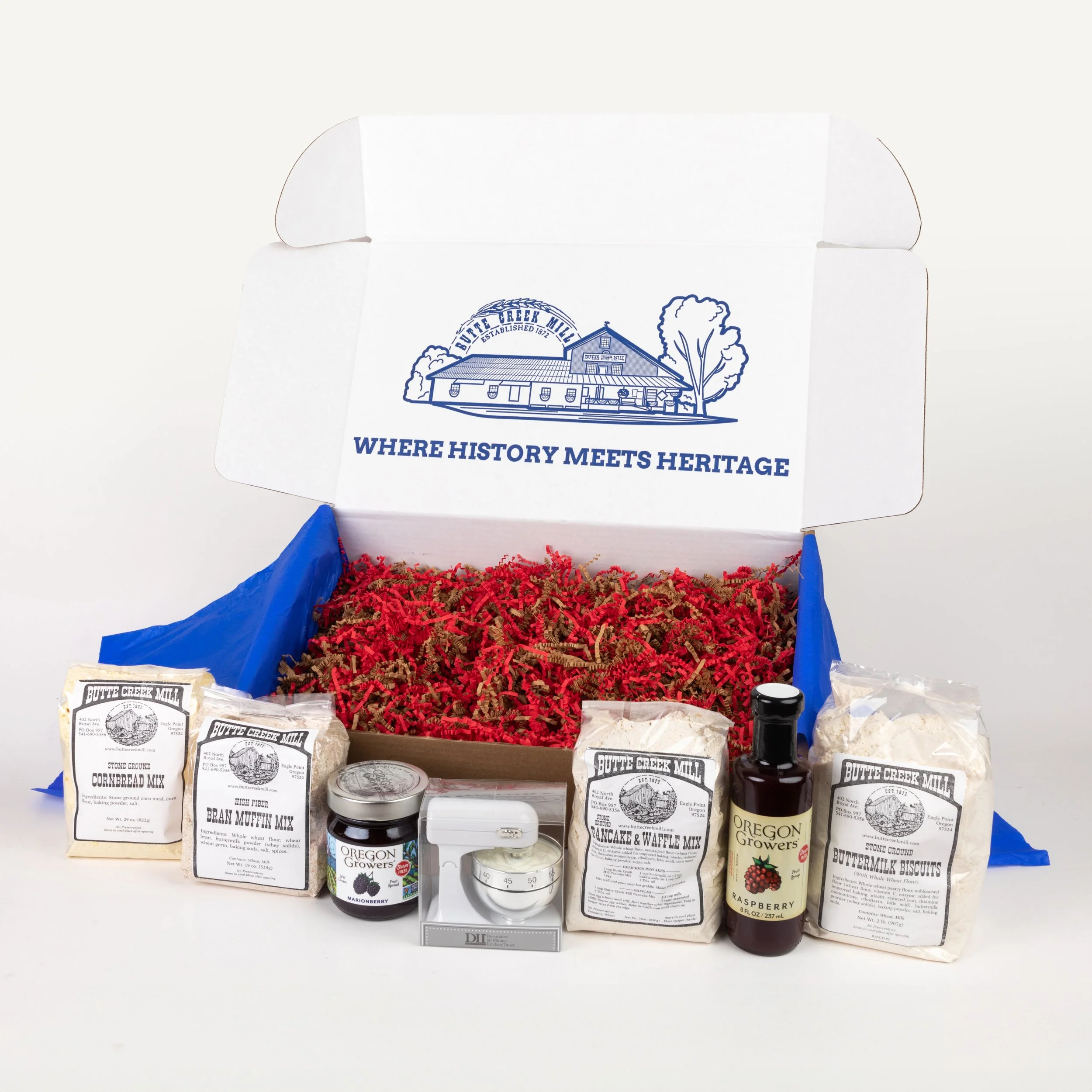 Holiday gift boxes curated and sold by the Butte Creek Mill- the oldest gain mill West of the Mississippi and a landmark in Southern Oregon.